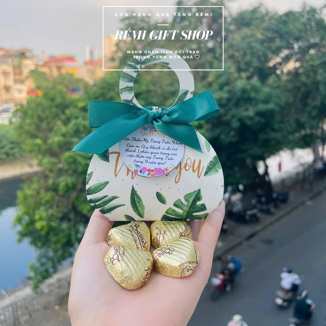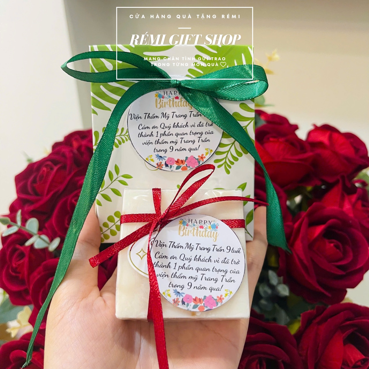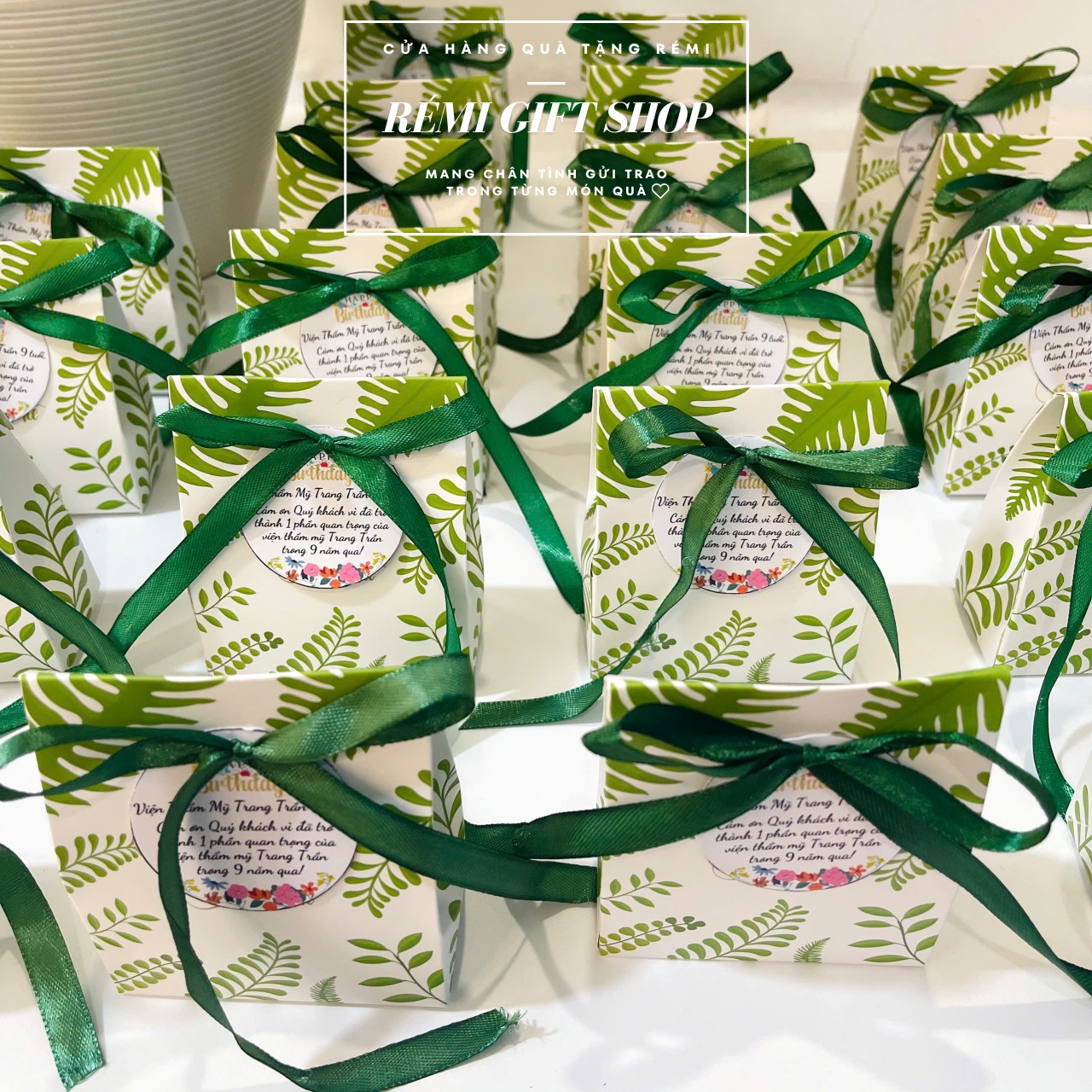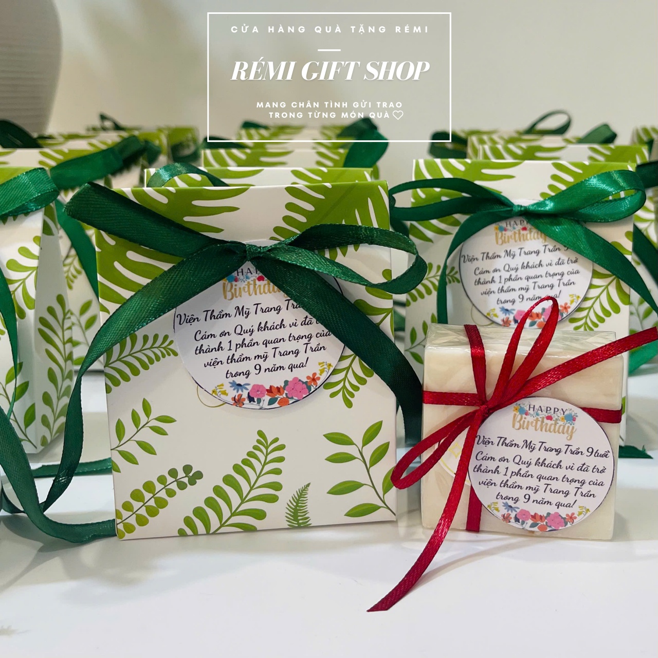 Bộ sản phẩm bao gồm: bánh xà phòng cám gạo, kẹo sô cô la, hộp đựng và tag thiết kế