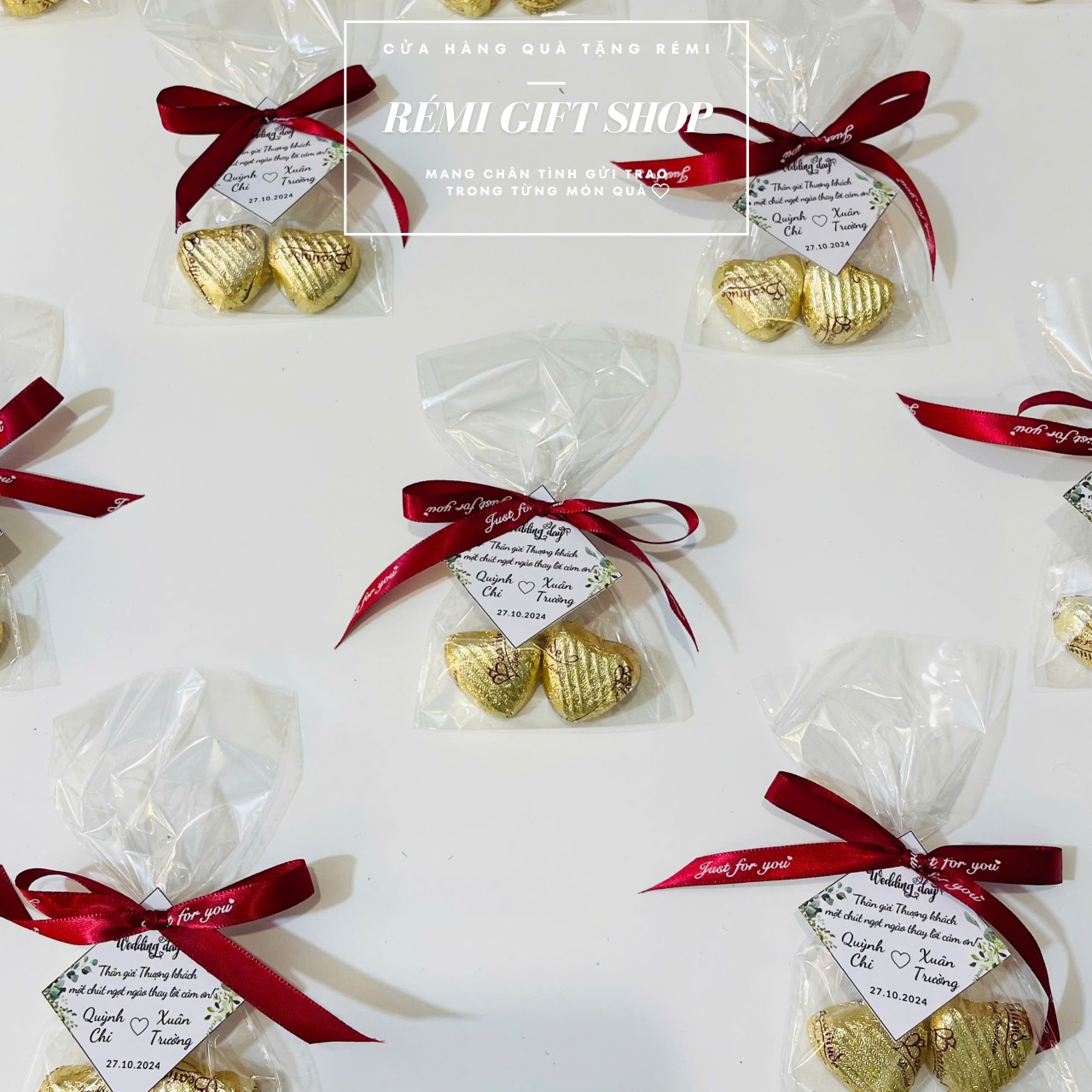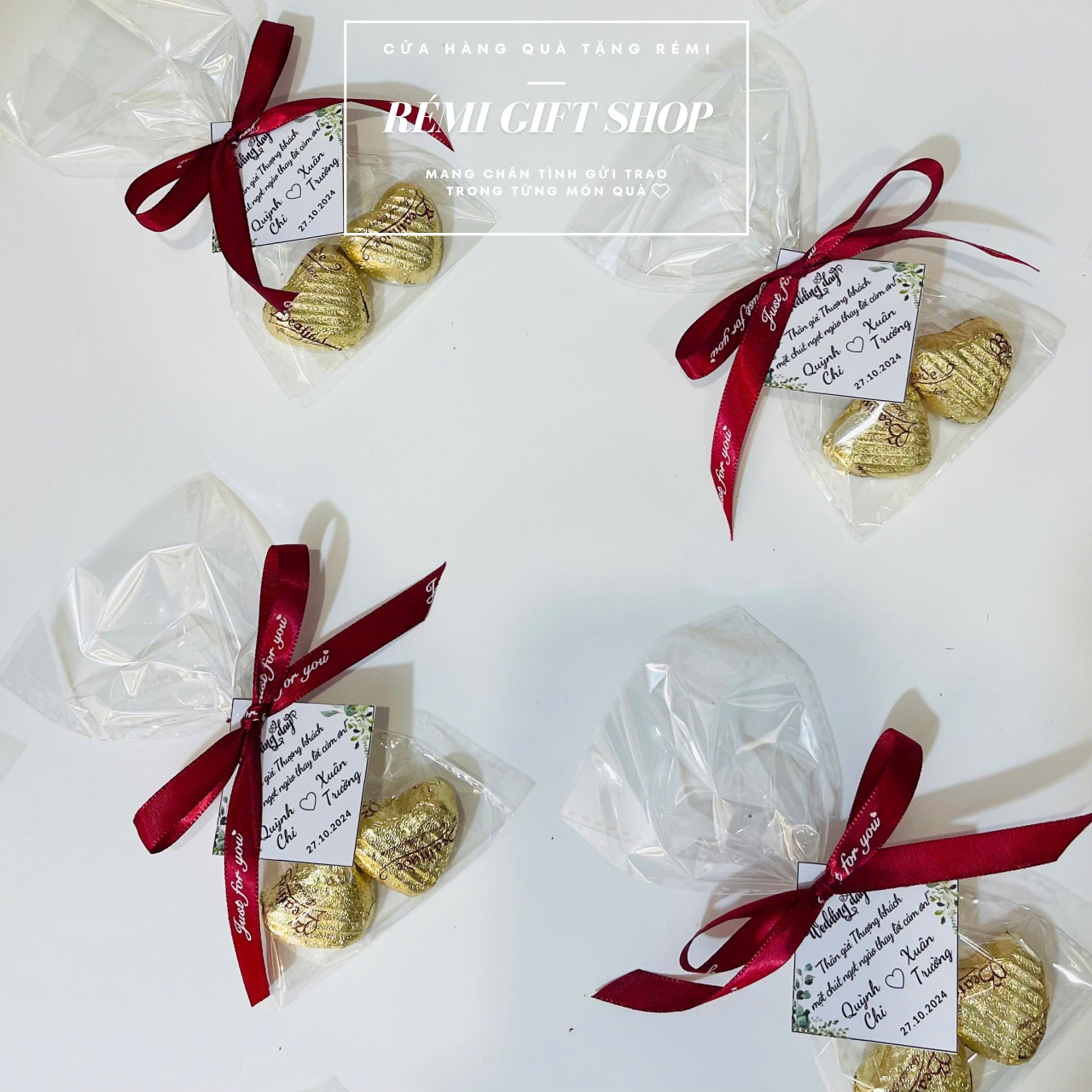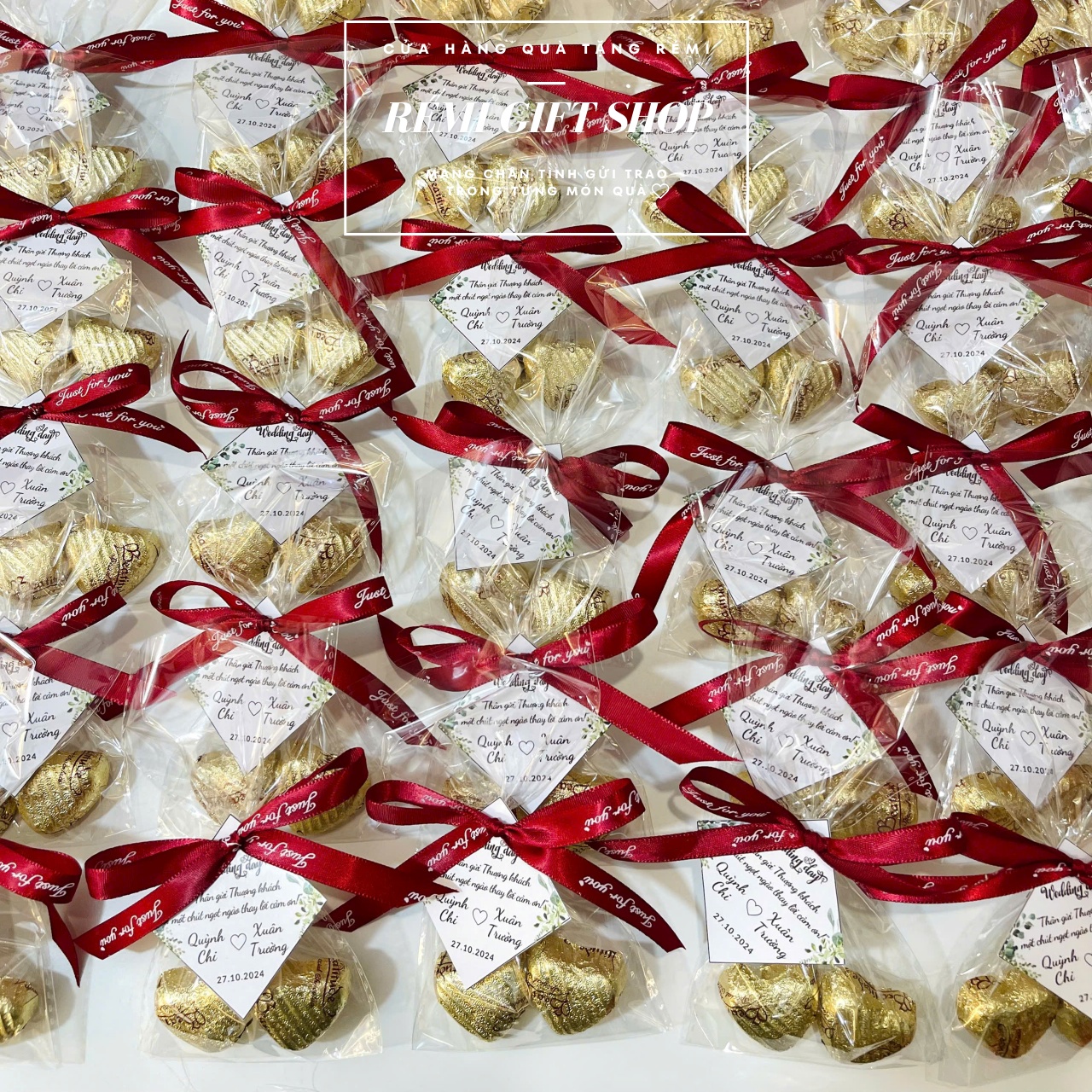 180 set túi kẹo 2 sô cô la thắt nơ kèm tag thiết kế xinh xắn