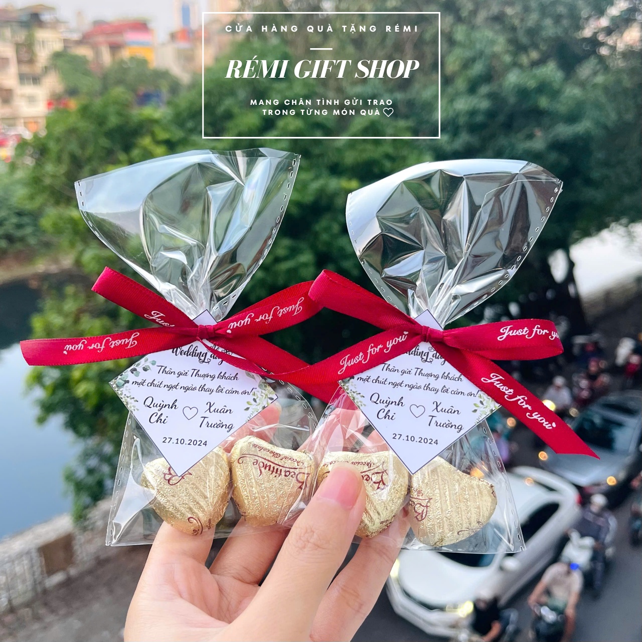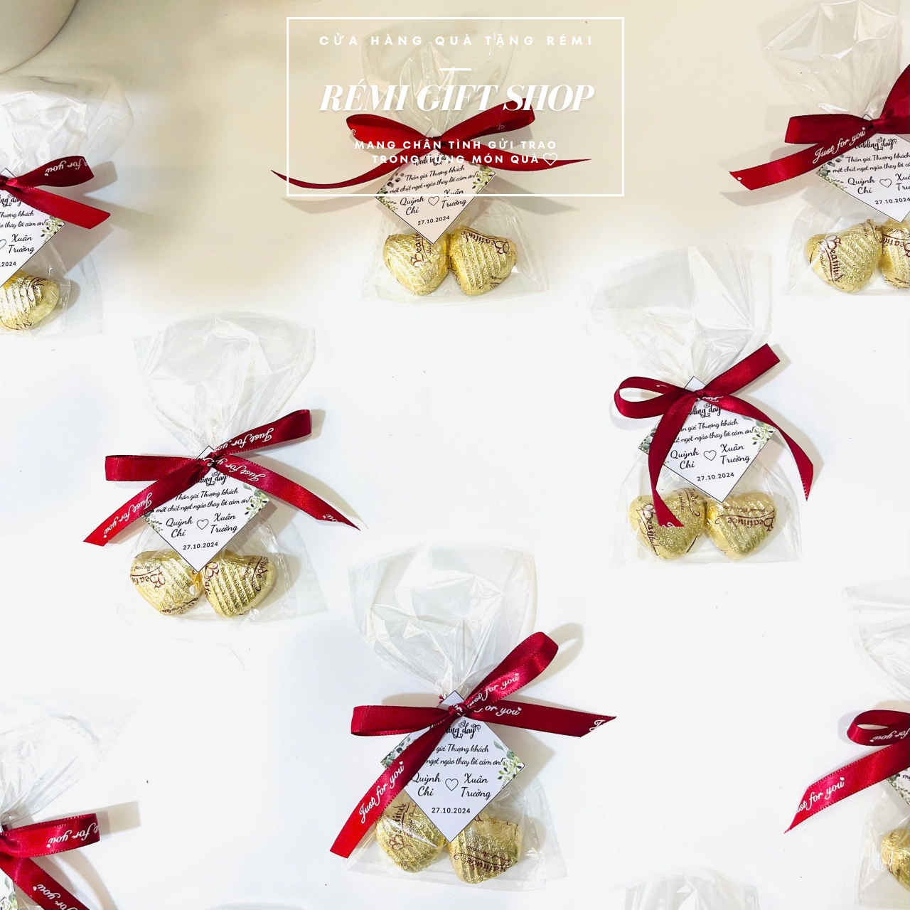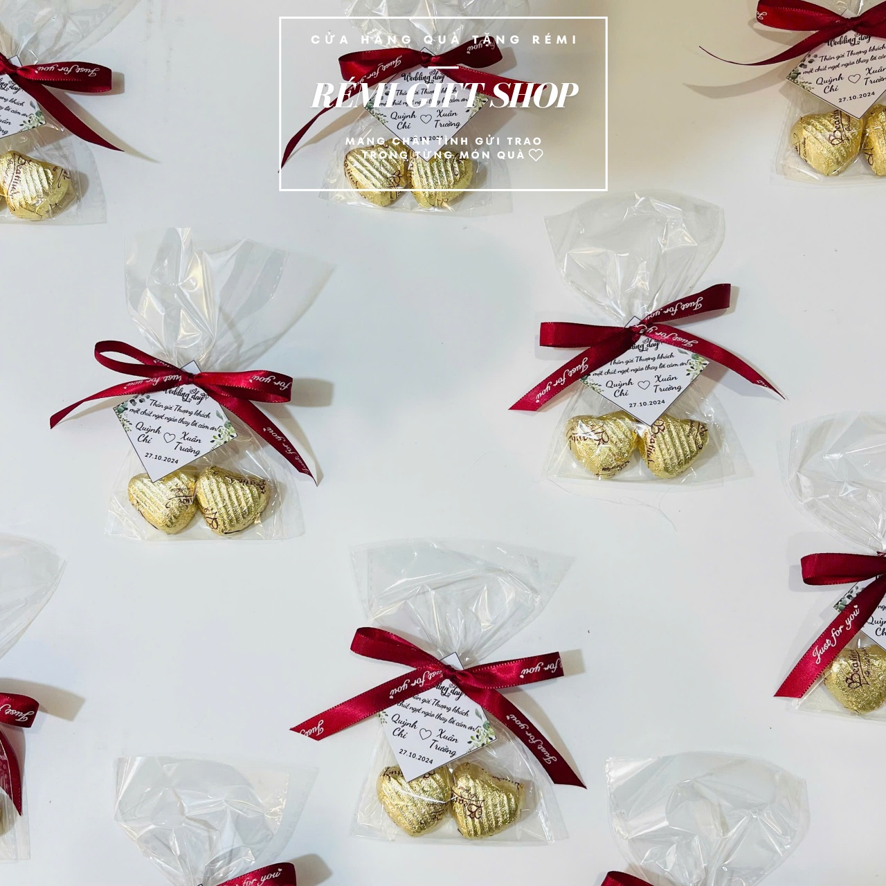 180 set túi kẹo 2 sô cô la thắt nơ kèm tag thiết kế xinh xắn
