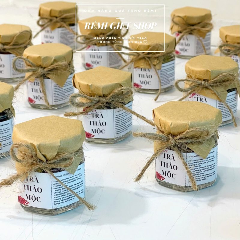 • Gợi ý từ RémiGift: Set trà hoa cúc, trà gạo lứt được đóng trong hũ thủy tinh hoặc túi zip kraft. Tất cả đều được đính kèm tag cảm ơn in logo.
